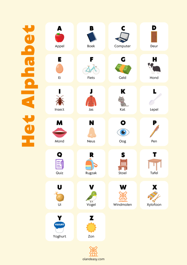 Per fortuna, l’alfabeto olandese (het alphabet) è sostanzialmente identico a quello italiano esteso di 26 lettere, cioè includendo anche K, J, W, X, Y.